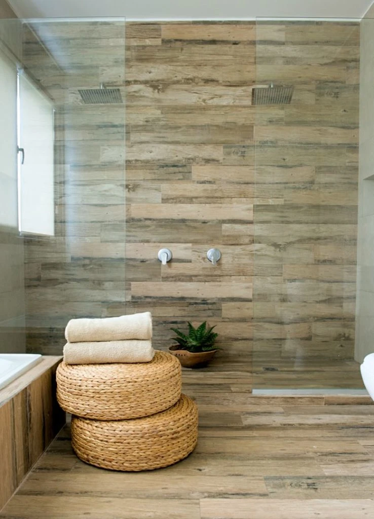 El baño repite el mismo revestimiento del resto de la casa: porcellanatos Itagress Nantes color natural, en una caja continua de piso y paredes. Junto a la bañadera con mamparas de vidrio, pufs de fibras naturales para apoyar las toallas yplanta de aloe vera en maceta vintage.