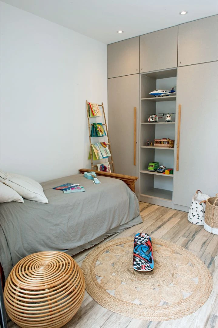 En el cuarto de uno de los chicos, hay una cama reciclada en madera de pinotea (era de Fede, su papá), acolchado y almohadones (@solpaloudeco), alfombra redonda de yute calada, mesita Circus y escalerita de bambú para libros (@cheardecasa). El placard tiene puertas enteladas en lino gris (@elgaragemuebles). Cestos (@rapsodiahome).