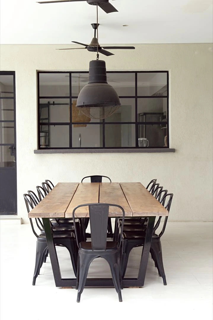 Una mesa de 3 metros de largo con sillas negras Tolix (compradas por la web) y una mega lampara galponera recuperada componen el comedor de exteriores. Los pisos son porcellanatos blancos Cortona Gesso.