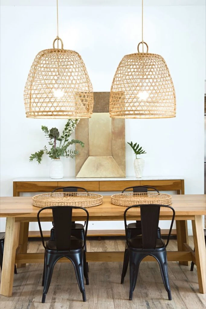 En el comedor, un recibidor en petiribí con tapa de mármol de Carrara, con floreros (@regiacasa) y cuadro con profundidad (@babydursi). La mesa es de petiribí (@cheardecasa) con sillas Tolix negras. Como centro de mesa, dos bandejas de fibras naturales, mismo material de las lámparas extralarge (@cheardecasa).