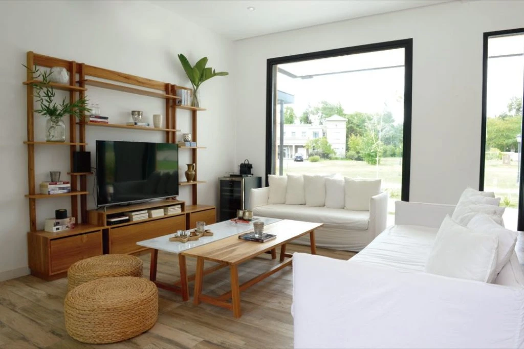 Blanco y fibras para este living luminoso y sencillo. Una biblioteca y mueble de tevé en madera de petiribí (@cheardecasa), con floreros (@regiacasa y @rapsodiahome con @ramasgratis) es aquí protagonista.
