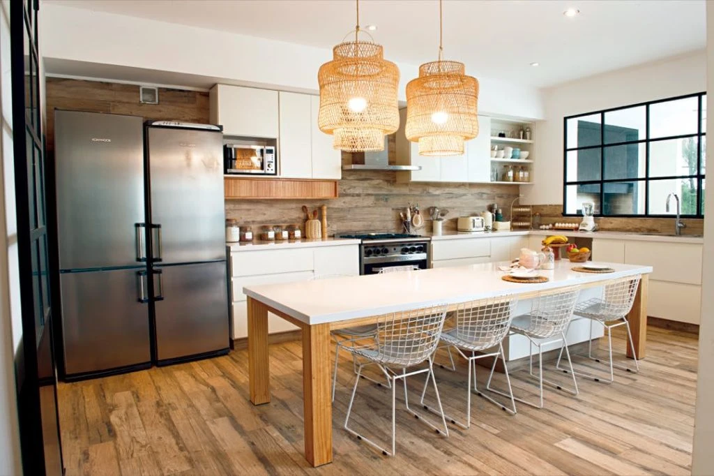 La cocina sorprende con el revestimiento en pocellanatos Itagress Nantes color natural que se repite en pisos y paredes. Para contrarrestar, la mesada y la mesa tienen tapa de Silestone Miami White, en un blanco impecable, al igual que el frente de los muebles laqueados mate (@elgaragemuebles).