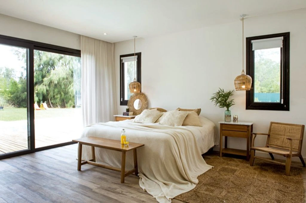 El cuarto principal mira al centro de la casa, donde está la pileta. Una gran alfombra de seagrass rectangular cubre aquí el piso de porcellanatos Itagress Nantes color natural. Sobre la cama, almohadones (@rapsodiaoficial) y manta comprada en Miami.
