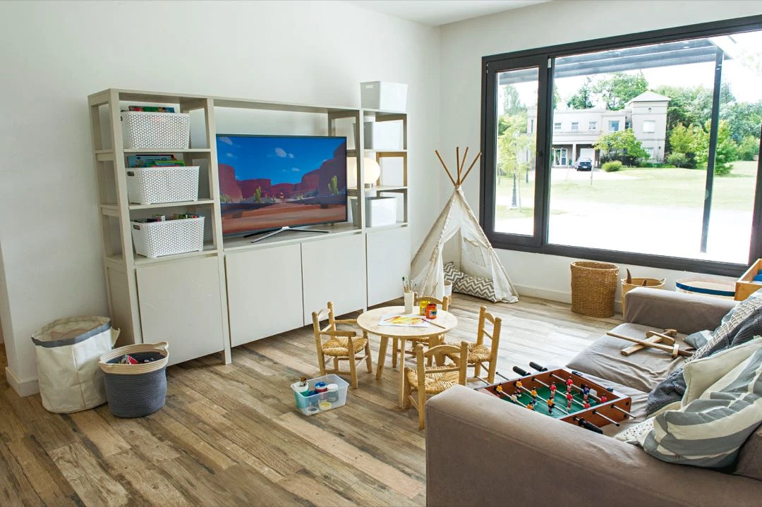 En el playroom, clima de juegos y relax con un sillón gastado, una carpita Tipi comprada por la web, mesa y sillitas de madera (Mercado de Frutos) y biblioteca color gris pluma (@cheardecasa).