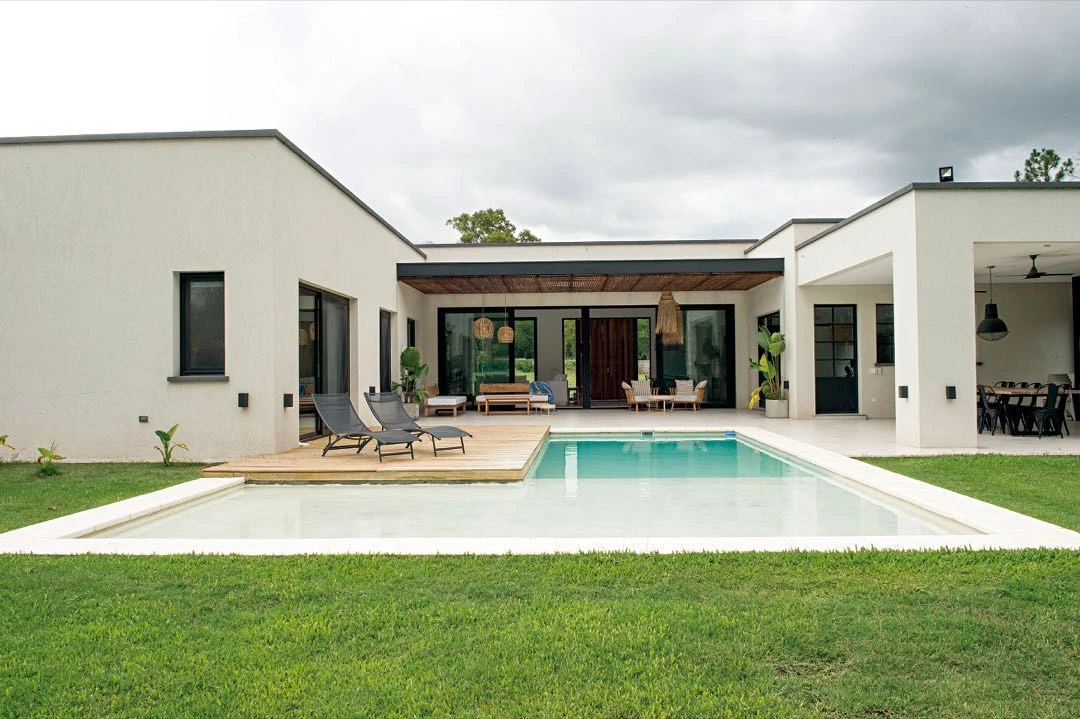 La casa se diseñó en una sola planta. Es toda blanca, con detalles en hierro negro y una fachada recubierta en madera de guayubira que le da personalidad. Tiene 298 m2 y 100 m2 descubiertos. Al centro, una pileta de 7 x 3.5 metros, con una playa húmeda para los chicos de 3 x 7 metros. El deck es de madera de guayubira, de 3 x 7 metros. Paisajismo (@hiedrapaisajismourbano).