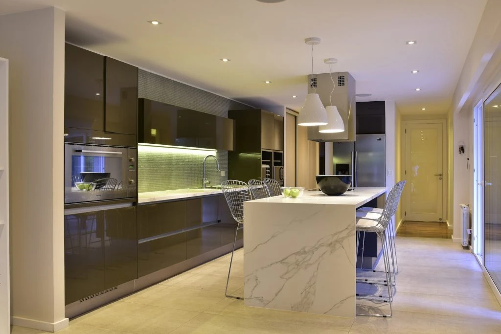 La cocina se hizo a nuevo con una isla de mármol Neoltih Calacatta (http://www.marmoleriagaona.com) con el anafe al centro y su campana de acero para extracción. Dos lámparas colgantes de cerámica blanca (A3 diseño) bajan sobre el sector de comer y cocinar. Un maxi cuenco negro (George Home Couture) se ubica a modo de centro de mesa. Las cómodas banquetas son modelo Bertoia (http://newtonba.com.ar). Placas de venecitas grises (http://familiabercomat.com) revisten los muros. El equipamiento, ultrabrillante, es de la línea Gofratto Gloss (https://www.johnsonacero.com). Para los pisos el estudio seleccionó el porcelanatto Cinza de Portobello (http://familiabercomat.com).