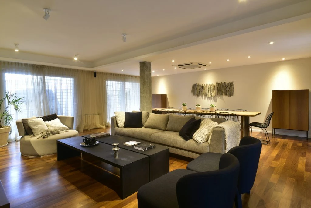 En el sector del living se ubicó un sofá de 3 metros de largo junto a un mega puf redondo con diseño de Maxalto. Ambos están tapizados en jacquard beige, y llevan mantas y almohadones de lana tejidos a mano. Los acompaña un par de sillones individuales modernos tapizados en riguroso negro (The black tapiceros) . Dos mesas largas en metal negro se ocupan del centro de la escena. A espaldas del conjunto aparece el comedor, con una imponente obra de Jorge Sarsale en negros y crudos pegada directamente sobre la pared. Sus colores acompañan los que se desprenden del mesón de madera y de las sillas Bertoia negras (Manifesto).