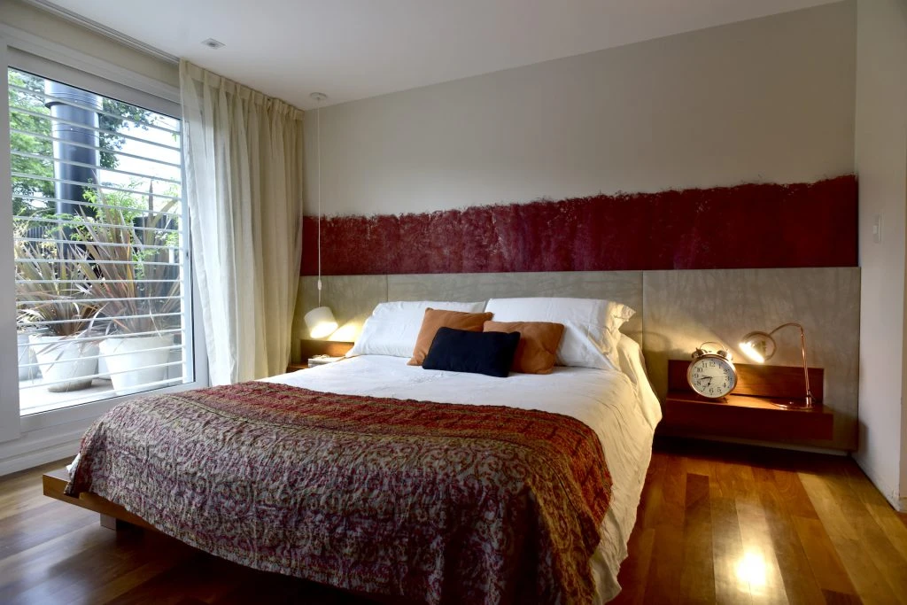 La ambientación del dormitorio principal tuvo varios condimentos. Las arquitectas del estudio GGYA optaron por revestir en cuero ecológico acolchado un respaldo que va de pared a pared, y diseñaron una cama con plataforma de madera y dos mesas de luz suspendidas con cajoneras en madera lustrada. Al acolchado de lino lo combinaron con almohadones de seda y un pie de cama floreado (http://lacompaniadeloriente) traídos de Uruguay. Una obra en papel del artista Jorge Sarsale en tonos rojizos recorre la pared de punta a punta. Junto al ventanal cae una pantalla colgante (http://www.griscan-di.com.ar) que aporta la luz de noche.