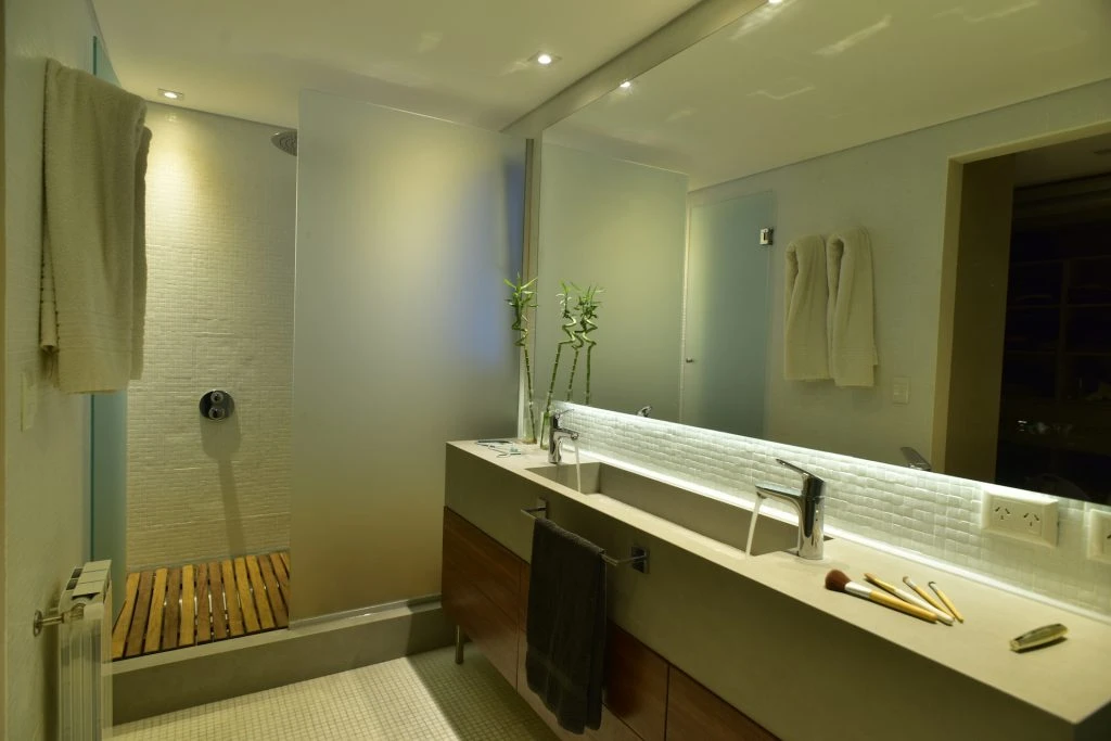 Una imagen del baño de la suite diseñado por el estudio GGYA. La mesada extra large con su bacha embutida está realizada en Neolith Phedra, con griferías monocomando de la serie creada por Antonio Citterio para Hansgrohe (http://www.folkdesigner.com) se ubican a uno y otro lado. La contiene un mueble de guardado realizado en madera paraíso (www.flagmuebles.com.ar).Como revestimiento de paredes y piso, venecitas blancas (www.familiabercomat.com). Sobre el espejo pegado a fila se refleja la mampara de vidrio esmerilado (/mundocristalsrl.com.ar). Unos bambúes chinos decoran el ambiente.