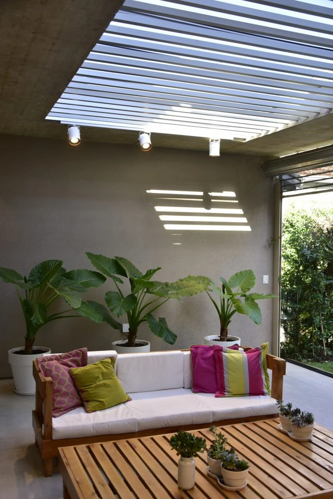 A continuación del área social, la galería propone muebles de madera (lasmarinasmuebles.net) sobre pisos de porcellanato (/www.portobello.com.br). El color lo aporta el surtido de almohadones (Arredo y Falabella). Atrás en maceteros blancos (www.galantebruno.com.ar) los bananos aportan la cuota de verde.