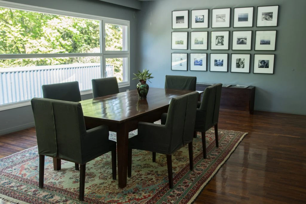 En cambio la sala de reuniones se pensó con un doble uso: si la ocasión lo amerita, rápidamente se convierte en un comedor formal. Sus paredes pintadas de gris Cosmos (Alba) están decoradas con fotos de Virginia Sainz. Una gran mesa de lapacho rodeada de sillas de madera con funda de bull (Next) descansa sobre alfombra del Mercado de Pulgas de Dorrego.