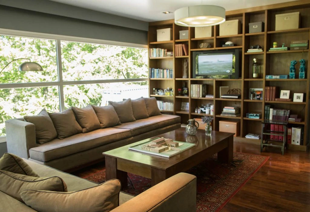 En otro sector de la gran planta se ubicó el living principal, que se hizo prácticamente a nuevo. Para los pisos se usó un entablonado de incienso que luego se abrigó con una alfombra antigua (http://www.mihranalfombras.com.ar). Dos sofás XXL ubicados en "L" y tapizados en pana beige con ribete de cuero (La Corte) hacen centro en torno a una mesa baja de lapacho lustrado, con maqueta y jarra antigua de cristal veneciano. Atrás, una biblioteca de incienso le da contención a la tevé.