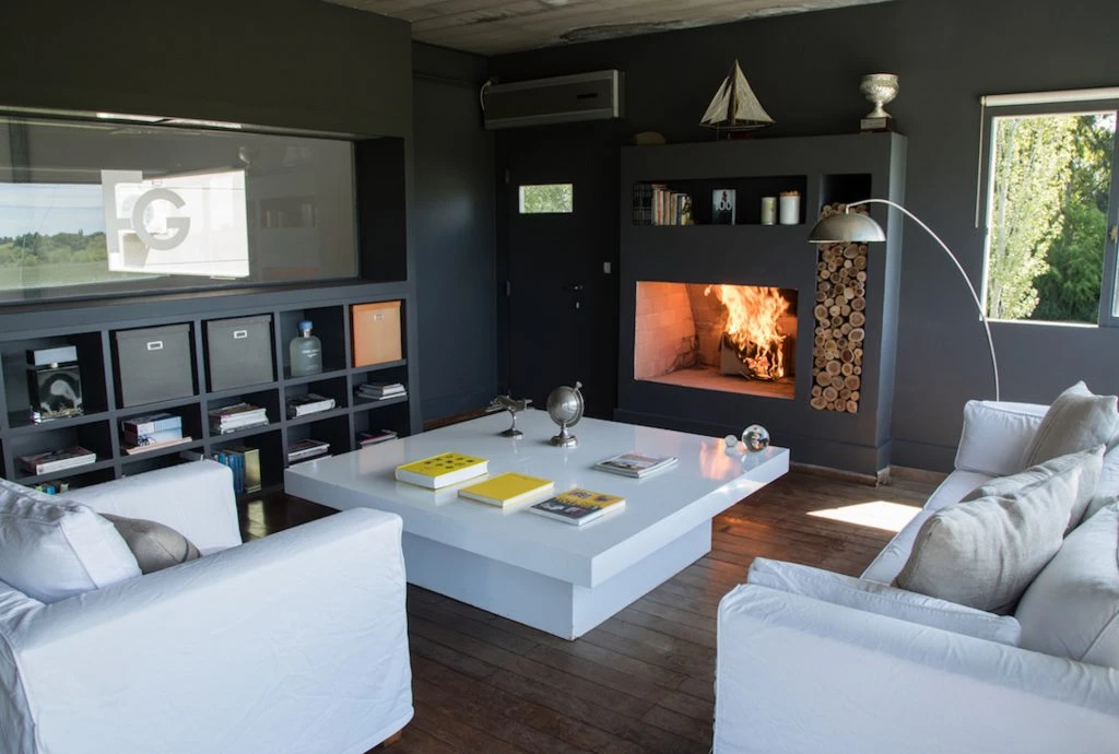 El reciclaje del edificio tuvo por fin sumar una cómoda vivienda en los pisos superiores de la fábrica. Y las dimensiones del lugar permitieron armar varios ambientes, entre ellos algunas áreas privadas y otras con un doble uso: trabajo y vida familiar. Por ejemplo, se optó por sumar un living informal y privado con unos sillones con fundas de bull blanco (Fradusco) y mesa de madera laqueada muy simple al centro. Para cerrar los laterales, el diseñador Andy Sainz (. [email protected]) dispuso una biblioteca baja de madera laqueada. En la pared central, una saliente de mampostería -también en gris intenso- le da lugar a la chimenea, la leñera vertical y unos nichos decorativos para objetos selectos, entre ellos, veleros y libros. De costado asoma una lámpara de pie en acabado níquel (Fábrica de Luz).