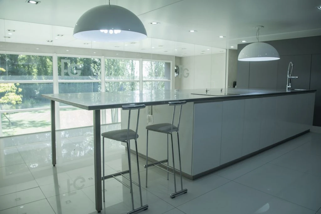 En el primer piso se ubica también la cocina, impecable como un quirófano: pisos de porcellanato brillante (Cortes), muebles con puertas ciegas en madera laqueada mate, mesada de acero, anafe, grifería y electrodomésticos con frentes de acero. Unas campanas de acrílico se ocupan de la iluminación, aunque durante el día, la luz que regalan los ventanales con vista al parque no tienen competencia.