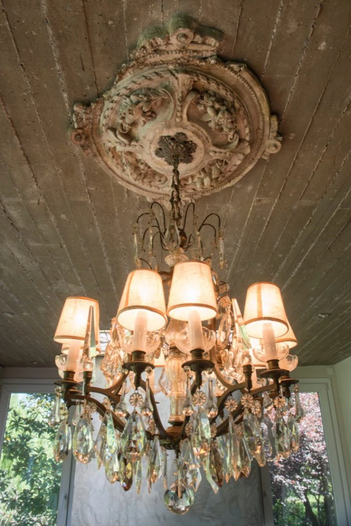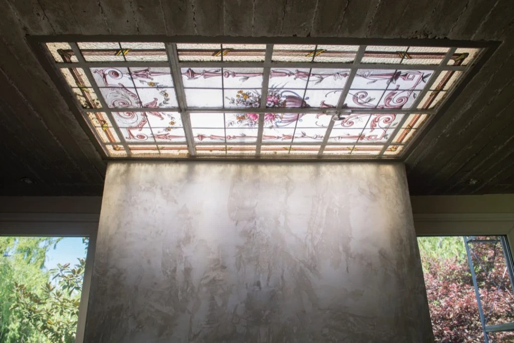 La galería como corazón de la casa en esta propuesta de Loly Albasini (http://lolyalbasini.com) coronada por un maravilloso jardín. Todo el espacio se rinde ante la chimenea de mampostería, que remata en una antigua lucarna de vitraux que la baña de luz natural. Por delante, una araña con caireles y pantallas de tela marca un fuerte contraste con el techo de encofrado a al vista.