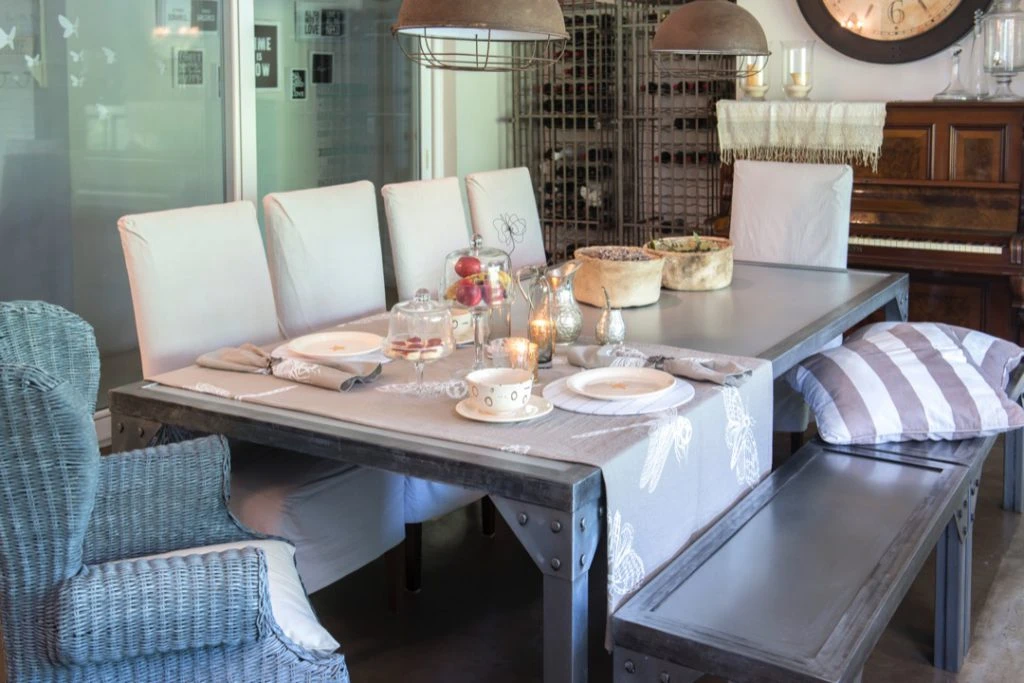 La mesa de comedor , las consolas auxiliares y las mesas de centro redondas son parte de la nueva colección de muebles para galerías de Loly Albasini. Simples, netos y con aire industrial, fabricados en hierro con un acabado de laca irregular que les da cierta calidez. Como sillón cabecero, una Bergére con su tapizado tejido en hilo de papel pintado de gris lavado (el gris provence que integra la nueva paleta de muebles de galería) invita a largas sobremesas de otoño a verano.