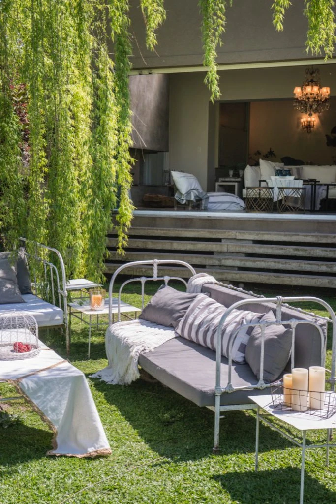 Afuera, en torno a un añejo sauce, un menú de muebles encantadores con el sello de Loly Albasini: camastros de hierro pintados de blanco para que destaquen mas sobre entorno verde, mesas de chapa simple , también de color blanco, en el rol de auxiliares, sillas de campo curtidas por el tiempo cona siento de tiento y unos bancos de madera maciza muy simples, se disponen en torno a un fogón. No faltan las mantas tejidas de algodón con detalle de pompones, las coronas decorativas y los caminos de mesa en lino con terminación en yute.