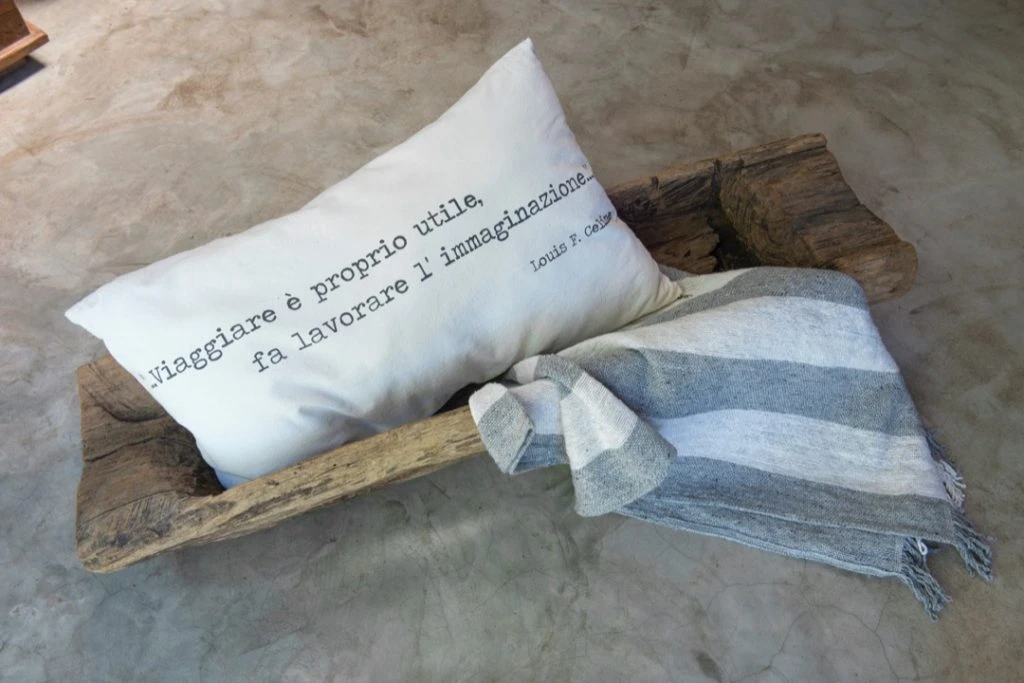 Los camastros de hierro pintados en negro mate tiene unos almohadones de tapicería confeccionados en bull que los hacen súper cómodos. Las consolas auxiliares y las mesas de centro redondas son la nueva colección de Loly Albasini: diseños con aire industrial fabricados en hierro, con un acabado de laca irregular que les da cierta calidez. Las acompaña sobre el piso un almohadón confeccionado en un Panamá de algodón rayado y tejido en telar, muy canchero. El resto de los almohadones son de algodón con detalles de inscripciones.