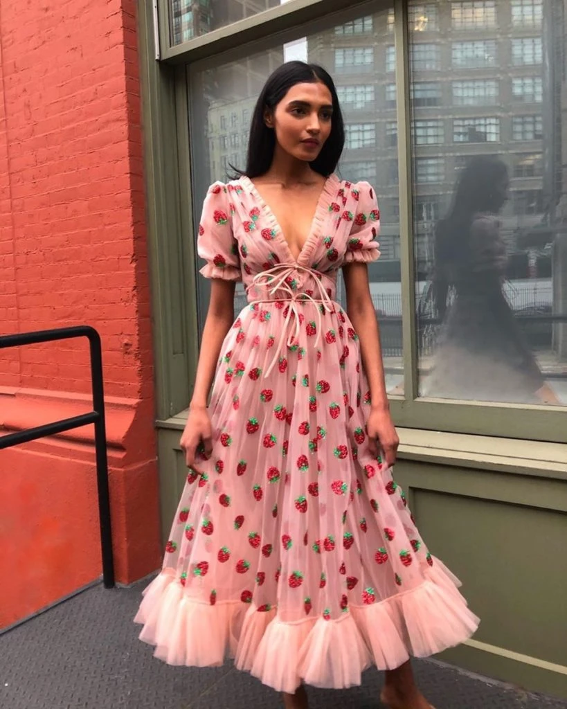La novedad es que hoy la misma prenda es furor entre los usuarios de la red social, en otro contexto y con otras modelos: influencers tik tokers de todo el mundo usan el mismo vestido frutillitas y lo postularon como una de las prendas más trendy de la temporada.