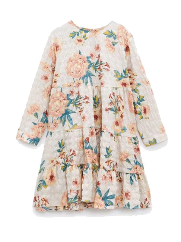 Alejándose del estilo de su madre, que siempre busca potenciar su cintura mediante diseños de cuerpo entallado, la infanta Sofía se inclina por una prenda totalmente evasé. Se trata de un vestido de cuello redondeado, manga larga y silueta en línea 'A' confeccionado en un tejido adornado con un original juego de texturas. Lo acompañó de sus inseparables "chatitas", en este caso un par dorado con detalles de rejilla, y llevó una campera de jeans en la mano.
