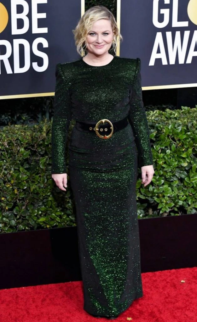 Amy Phoehler también llevó un vestido al cuerpo íntegramente bordado. Las hombreras ayudaron a realzar la silueta y con el cinturón negro marcó la cintura.