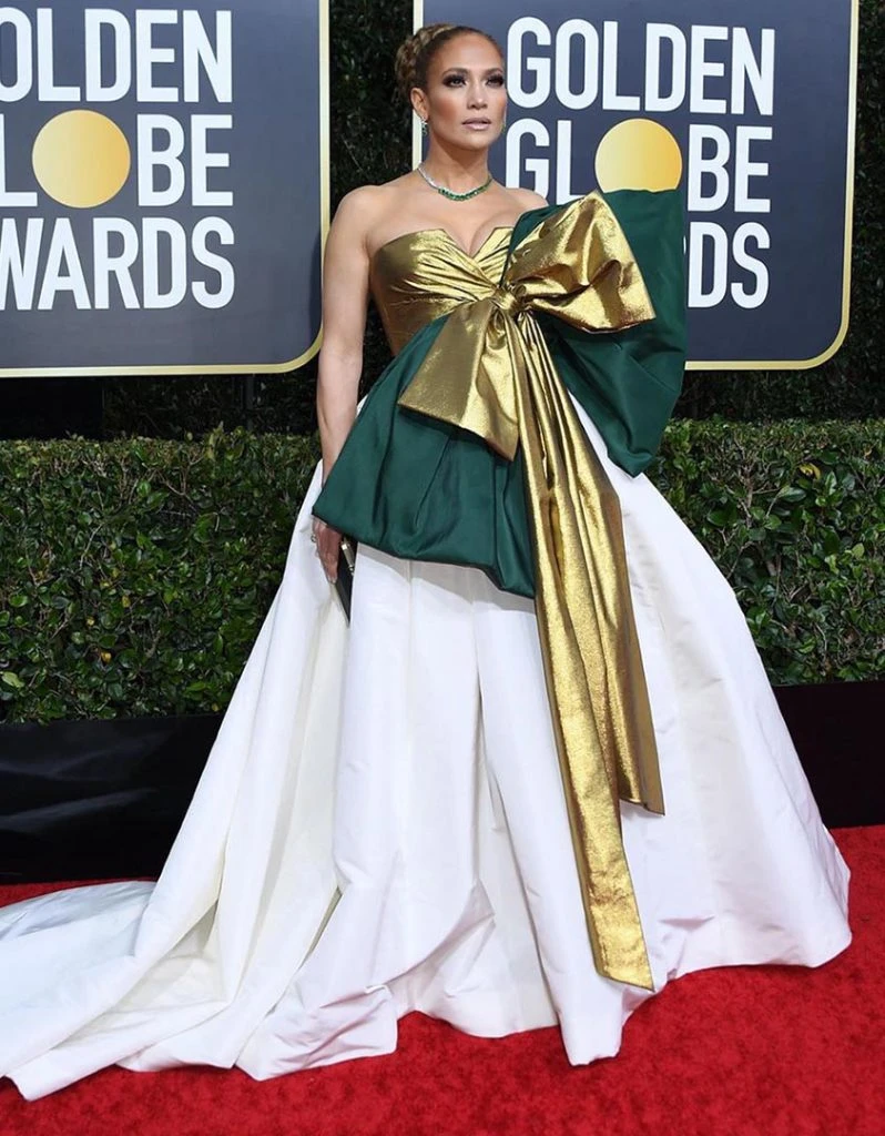 Jennifer López, una de las nominadas a mejor actriz de reparto en los Golden Globe 2020, brilló en la alfombra roja. Eligió un vestido de la colección de Valentino Couture, donde grandes moños en color verde y dorado decoraban su espectacular vestido.