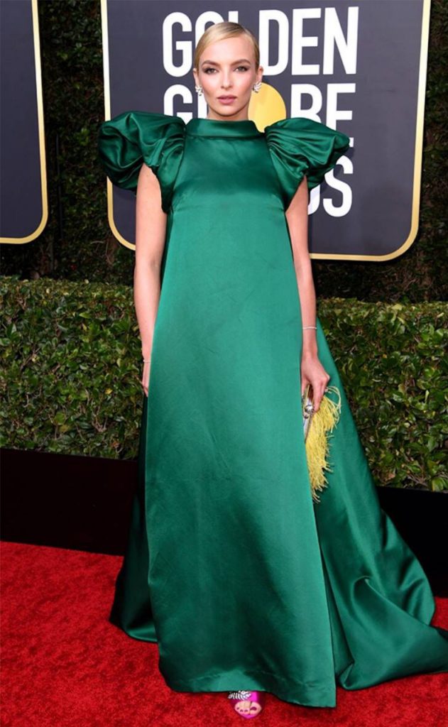 También la actriz Jodie Corner apostó al color verde con un look de Mary Katrantzou de la colección primavera verano 2020. Un vestido línea A donde las mangas fueron protagonistas. Llevó accesorios en color shoking como el clutch de plumas amarillas y los peeptoe en color fucsia.