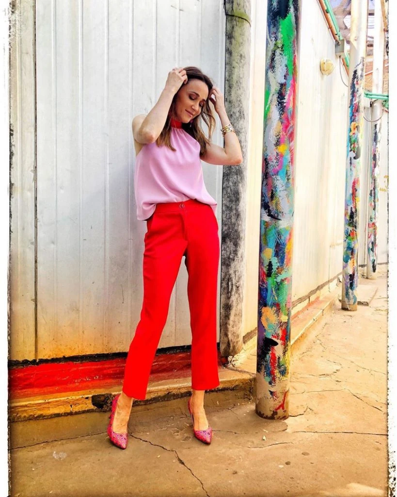 Antes nunca se nos hubiera ocurrido combinar rosa con rojo. Pero esta temporada se usan las mezclas audaces como ésta y Vero Lozano no dudó en implementarla en su guardarropa.