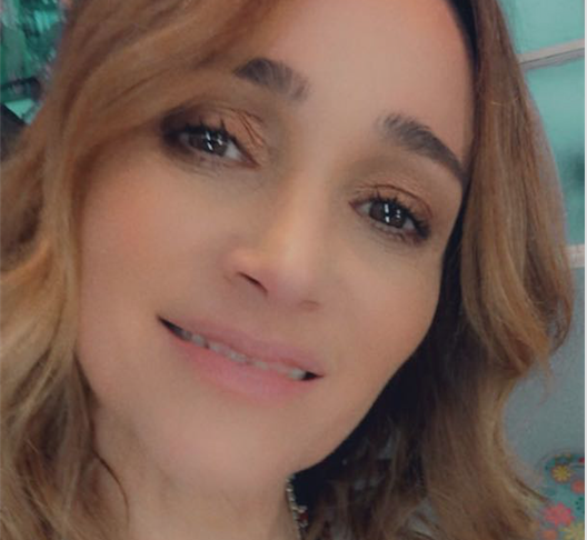 El look de Vero es de Ginebra y los zapatos de Valdez, más accesorios de Los Vados del Isen. Acompañó el loo con un peinado con ondas ligeras hechas con planchita por Cristina Cagnina.
