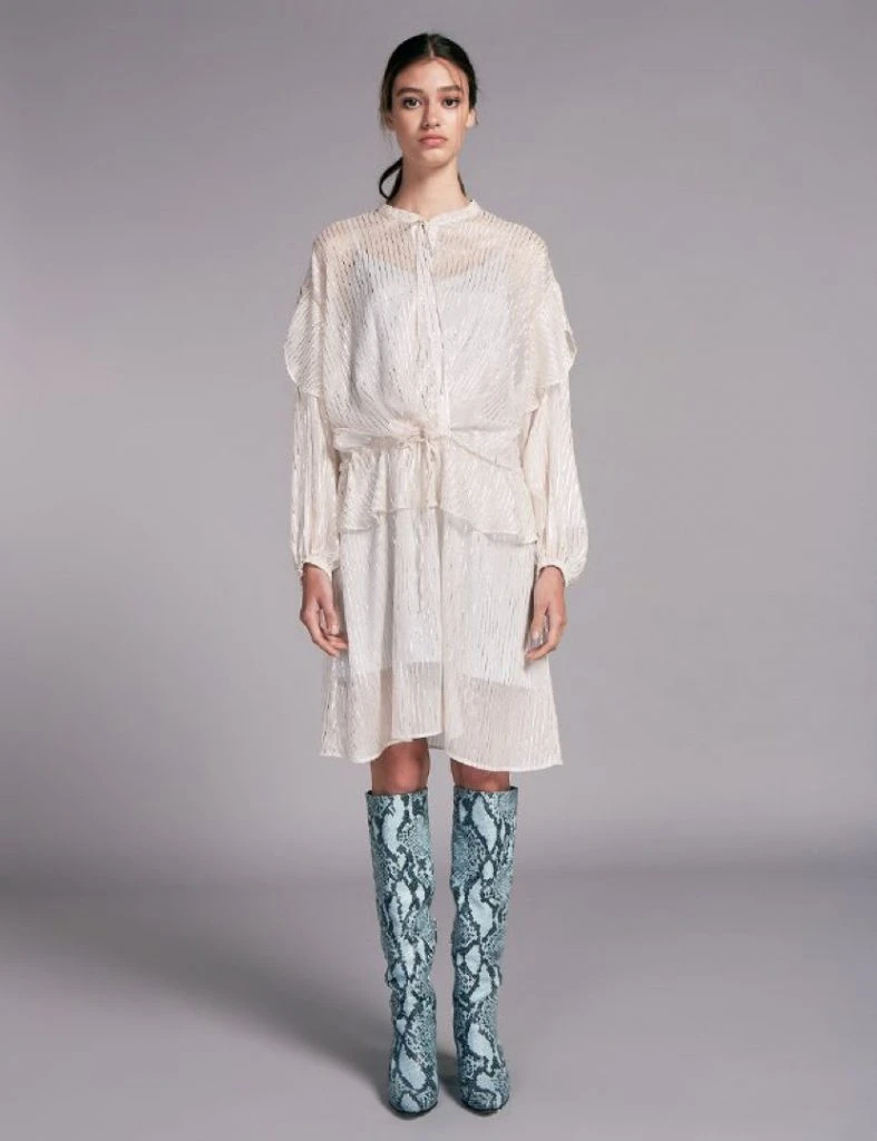 Y Vero Lozano siempre está a la vanguardia de la moda. La conductora se adelanta a llevar prendas que marcarán tendencia y esta vez, usó un vestido de gasa con hilos metálicos con recorte en la cintura y volados estratégicamente ubicados de la etiqueta Ginebra.