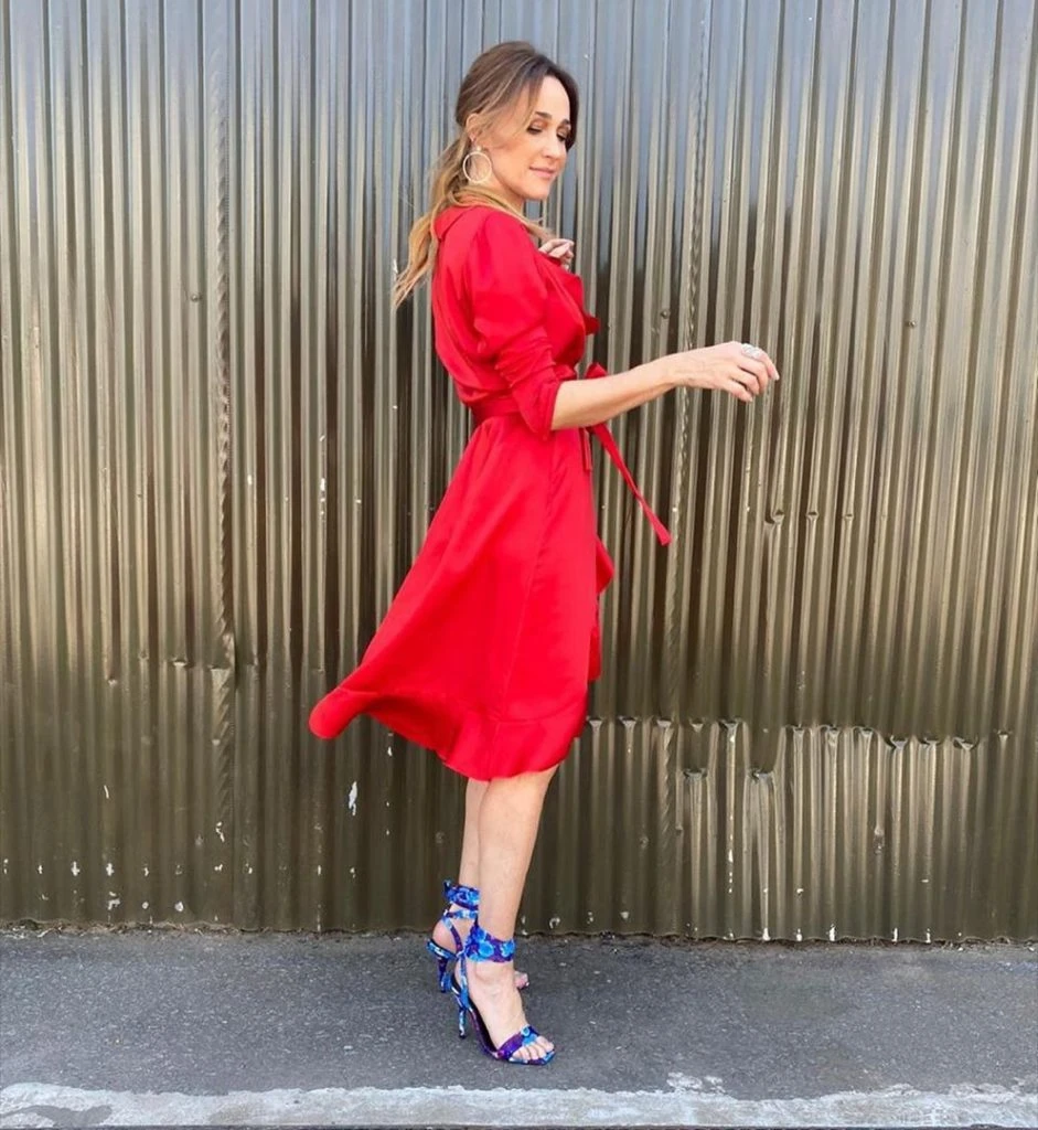 Precisamente Vero Lozano llevó un vestido rojo perfecto para tener en el placard. Se trata de un diseño cruzado, con volado y mangas tres cuartos.