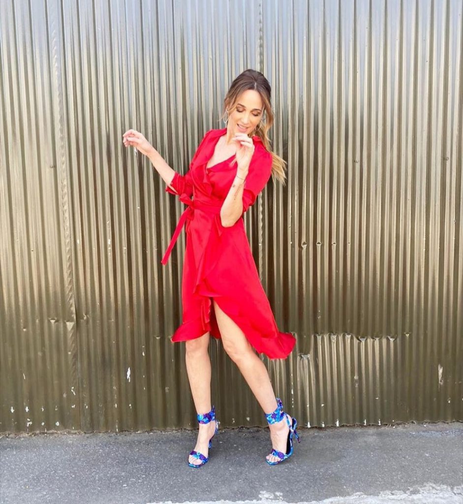 Precisamente Vero Lozano llevó un vestido rojo perfecto para tener en el placard. Se trata de un diseño cruzado, con volado y mangas tres cuartos.