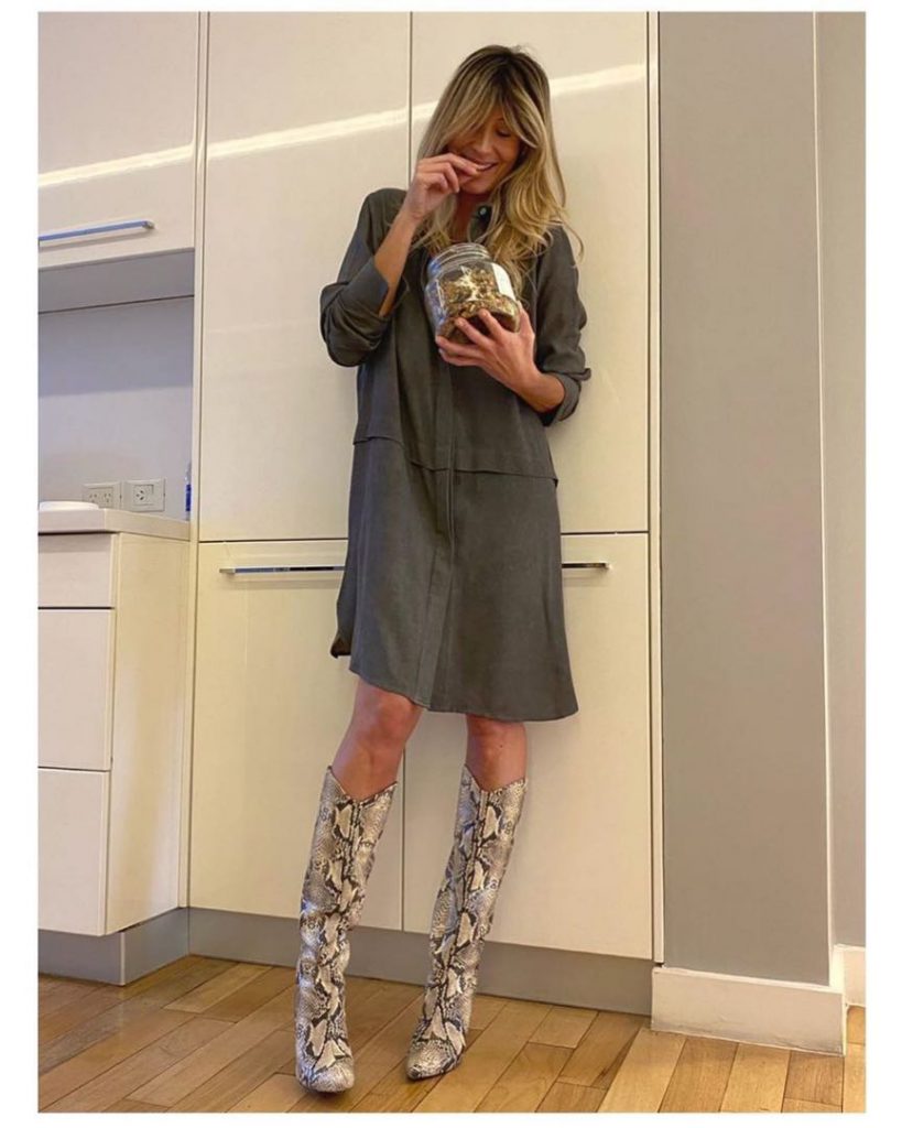 "Levante la mano quien picotea alguna cosita rica antes de la cena ?! ? ufff a mí hoy se me dio por esta granola casera !!! Pero siempre arriba para sacarme el pijama x un rato !!", posteó la modelo junto a la foto en la que se la ve con vestido tipo camisa en verde militar más botas altas animal print.