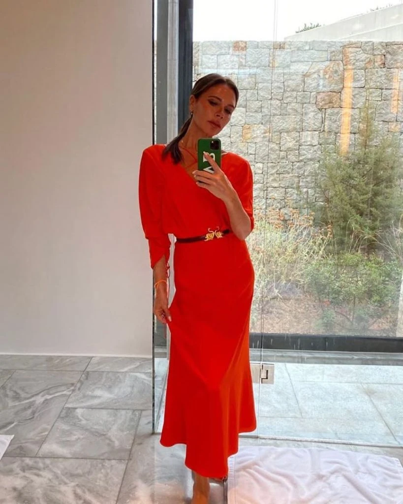 Esta vez Victoria eligió un vestido naranja shocking. Se trata de un vestido midi con mangas fruncidas. "Un vestido con un nuevo romanticismo: volados y fluidez pero sin volumen", explicó la diseñadora. El vestido es de la nueva colección pre otoño invierno 2020 y sale 1.490 euros.