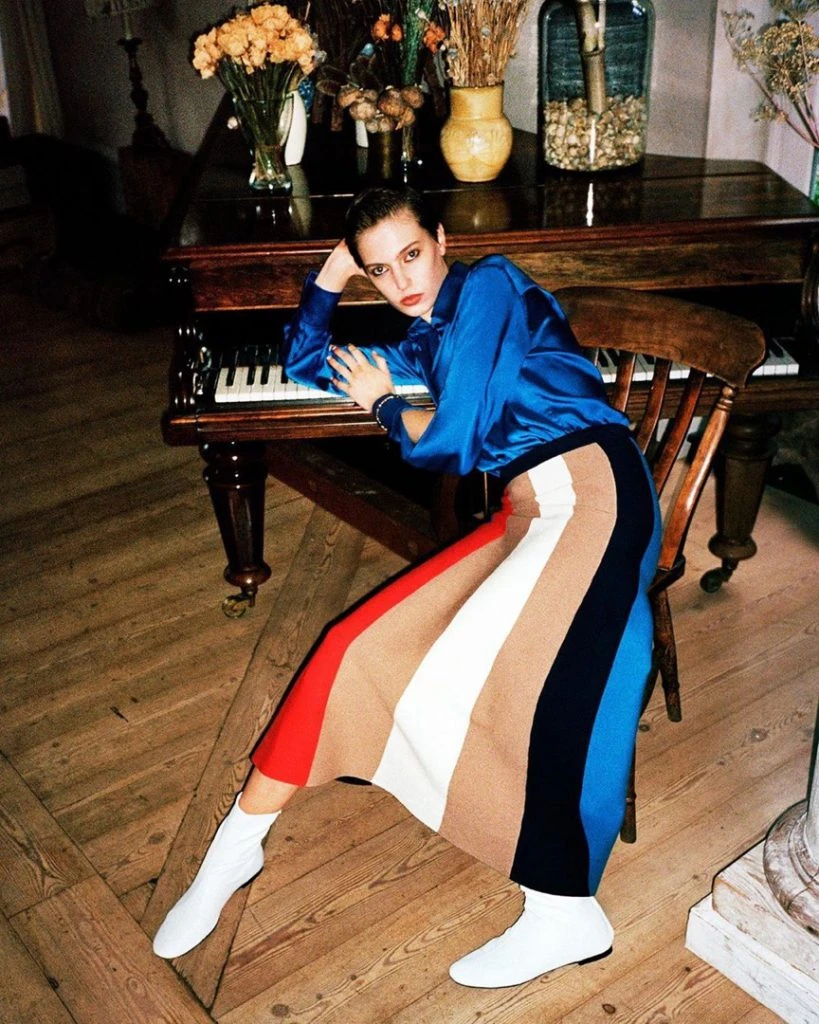 Para su última colección diseñó este suéter con cuello polera y pollera con rayas anchas multicolor. Ella en su lookbook lo propuso por separado pero también se puede usar todo junto sumándose a la tendencia matchy matchy.