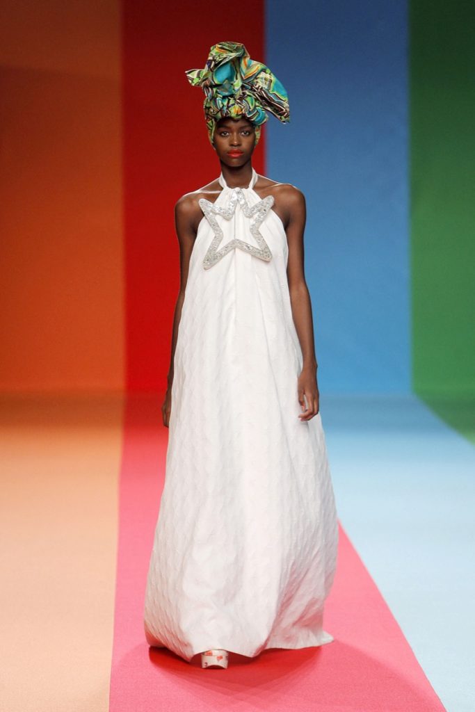 Las modelos desfilaron con grandes turbantes de telas estampadas de inspiración africana acompañando y aggiornando los fabulosos outfits.