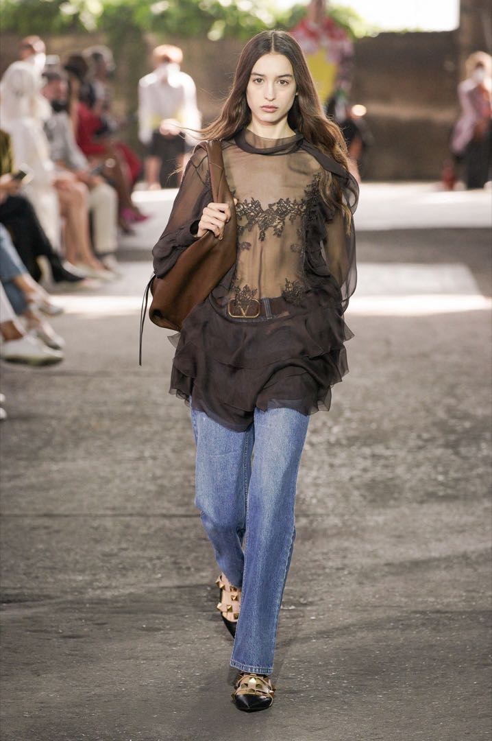 La mezcla de texturas también dijo presente. Brillos, transparencias y jeans, aplicaciones florales... El mundo de Valentino.