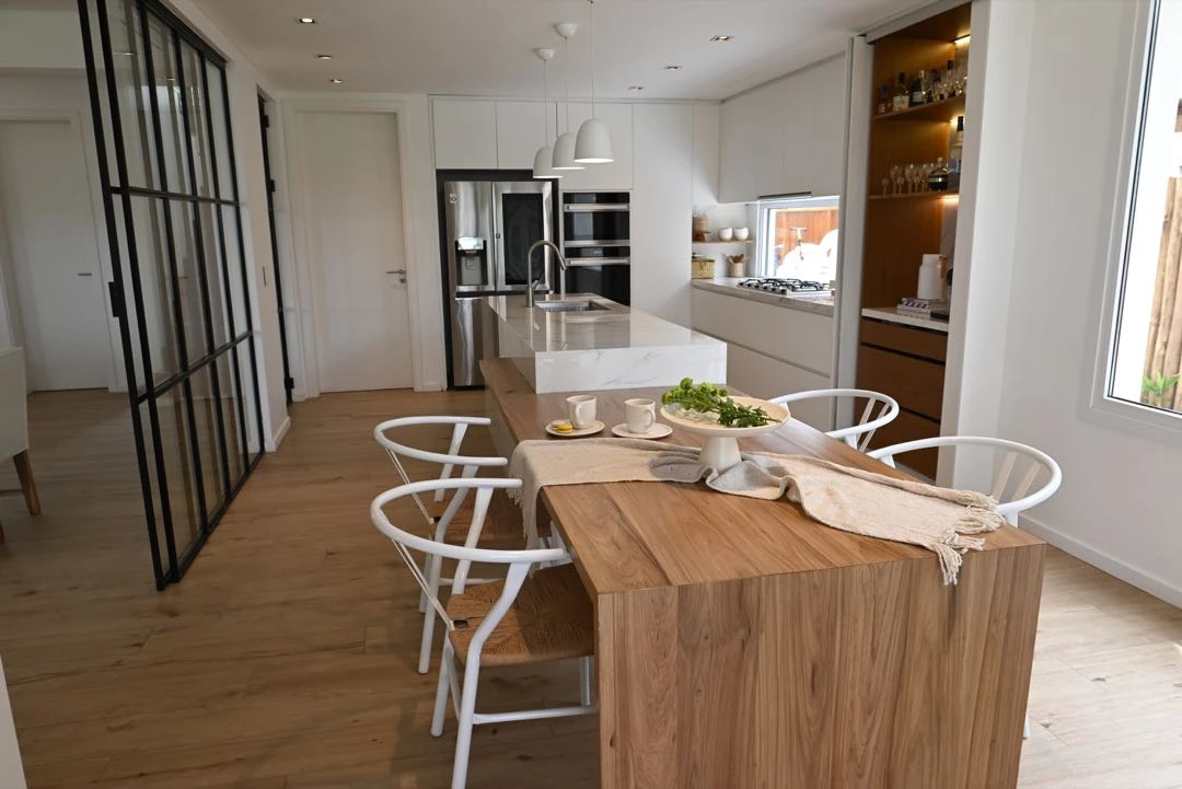 La casa de la decoradora Alex Ruiz (@conpasiondeco) está marcada por la presencia de grandes ventanales que la conectan con un paisaje de mucho verde. Pero la transparencia también es una virtud en interiores, donde unas bibliotecas de hierro y madera se ocupan de dividir ambientes sin cerrarlos por completo.