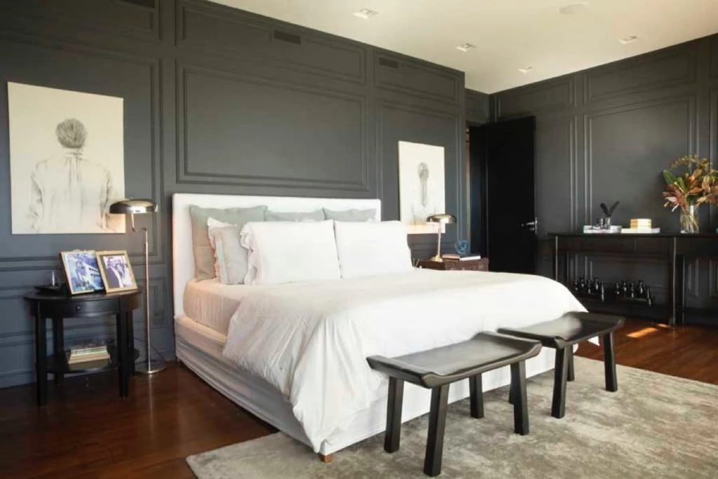 Negro, gris y blanco se conjugan en el elegante dormitorio principal, apenas salpicados por el marrón oscuro de la madera.
