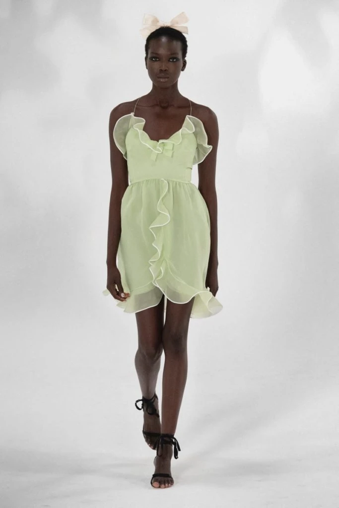 También se vieron mini shorts de lentejuelas, blusas con volados, moños que adornaban los looks y vestidos con volados en cascada como una propuesta nocturna y más sofisticada.
