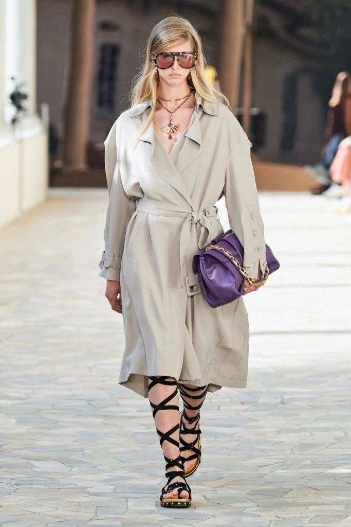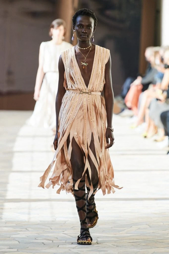 Todos los looks se aggiornaron con sandalias estilo romanas con tiras que se trenzaron en las piernas y con accesorios dorados. .