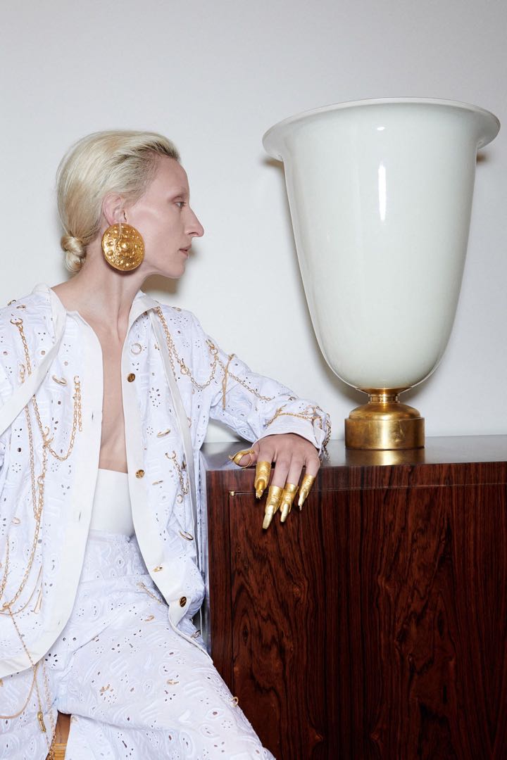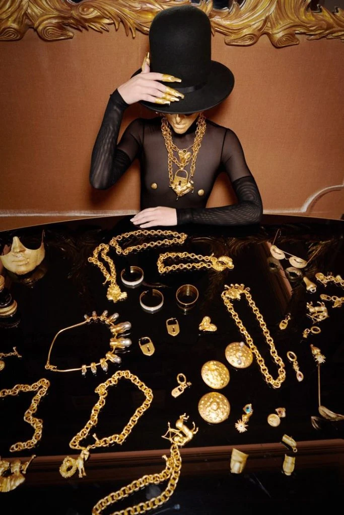 En el video detrás de escena que produjo la marca, se destacan los bijoux dorados de Roseberry: anteojos con ojos de esmalte en el centro, máscaras que cubren la nariz y la boca, garras de los dedos, e incluso botones de pezones.