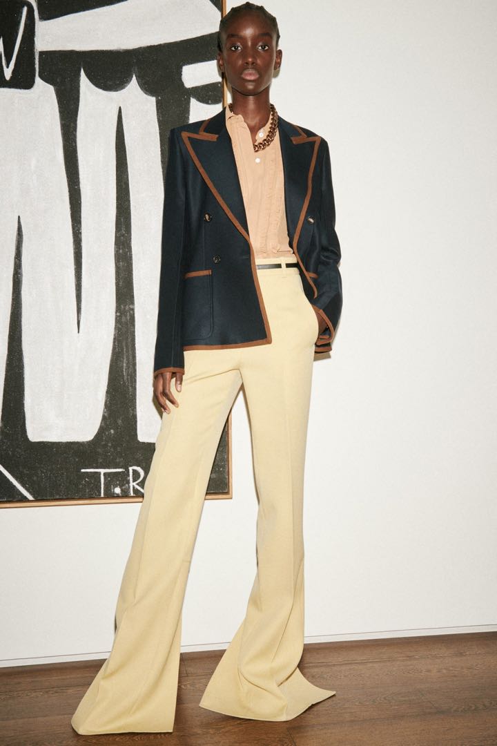 Los vestidos largos los combinó con collares de cadenas doradas. Fueron 21 looks con predominio de la sastrería y nitidez en el color.