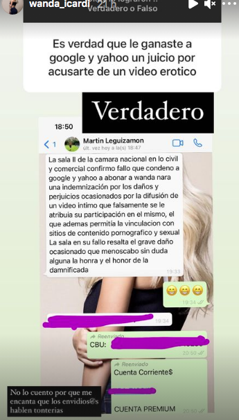 Luego la modelo dio explicaciones a sus seguidores acerca del juicio que le inició a Google y a Yahoo por haberla hecho partícipe de un video erótico. Bien explícita, la mediática subió a la plataforma un mensaje de su abogado donde se confirma que les ganó el juicio y que los buscadores de Internet tuvieron que indemnizarla por daños y perjucios. “La Sala II de la Cámara Nacional en lo Civil y Comercial confirmó el fallo que condenó a Google y Yahoo a abonar una indemnización a Wanda Nara por los daños y perjuicios ocasionados por la difusión de un video íntimo que falsamente se le atribuía su participación en el mismo”, dice el texto que Wanda mostró a sus fans.