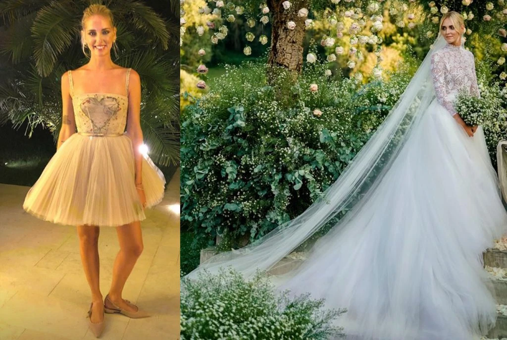Y cuando parecía que lo habíamos visto todo… ¡ella sorprendió en el medio de la fiesta con otro súper look! Chiara Ferragni se puso un segundo vestido de novia, de tul en tono topo con escote cuadrado y tirantes finos de alta costura de Christian Dior. Y el equipo de Maria Grazia Chiuri lo intervino contando la historia de amor entre Chiara y Fedez: un león rinde homenaje a su hijo Leone, está el ojo (la marca de identidad de la influencer italiana) y estrofas de “Favorisca I Sentimenti”, la canción que su marido, un reconocido cantante de rap, le compuso para pedirle matrimonio. El mini vestido tenía más símbolos bordados. ¡Un amor!